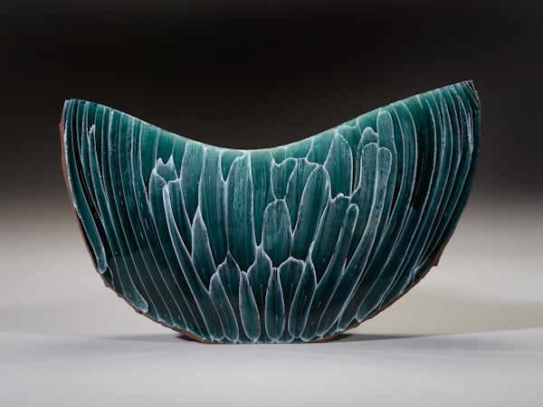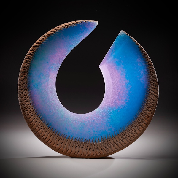 The forms of Bernstein’s pieces – as well as the techniques he uses to work the glass – mirror processes in nature, such as oxidation, erosion, growth and decay. As a result, many of his pieces evoke images of flowing water, ice crystals, mountain peaks and jagged canyons – all structures that seem solid and unyielding, but are actually in constant flux. The work reflects his sense of exploration: an exquisitely cut geometric crystal sculpture set against a brutal, rusted steel backdrop, volcanic bursts of cut glass spewing from a steel-encrusted base, layers of transparent color intermingling with ambient light. Alex’s sculptures reflect his feelings and sensitivity to others, curiosity and enthusiasm for bringing new dimensions to his sculpture.