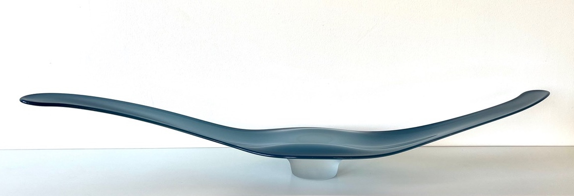 Goodman was a versatile glass artist who excelled in both glass blowing and casting techniques. He created beautiful, abstract, artistic forms such as his hand blown “Lima” vessels. These vessels were sandblasted to create a soft translucency and transmit light in a subtle and sensuous way. His “Ovelle” series was made with the same grace and translucency, but in addition, these lithe pieces evoke the human form. This reference is very abstract and subtle but the viewer definitely perceives human gesture, form and beauty in these vessels.