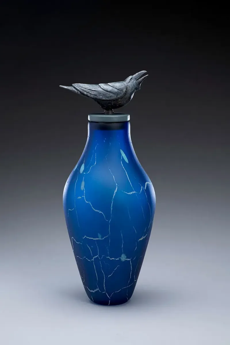 In his series of “Animal Spirit Jars”, Wright creates vessels that are rich in texture and color. The surfaces have a beautiful, soft matte finish and often feature dappled colors or web-like patterns that resemble cracks in ancient vessels. The lids are adorned with life-like, hand carved wood animals created by Hib Sabin; examples include a raven, hawk, toad and turtle. The animals add an element that suggests a ceremonial significance to these powerful vessels.