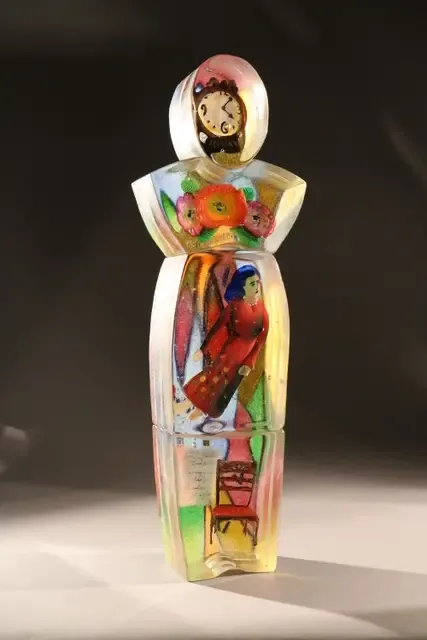 Stephanie Trenchard’s sculptures are like still-life’s cast in solid glass. First she sculpts objects and figures in glass. Then she begins the casting by making an impression in sand, applying patterns with glass powders, and then pouring molten glass (at temperatures above 2,000 oF) to fill the impression halfway. In the next step, she sets the glass object in the molten glass and paints in additional details. To create the details she uses Paradise paints, glass powders, and frits, achieving a luminosity rivaling any oil paint. She then pours in more glass to fill the impression and encase the object. The whole process of pouring and assembling the casting must be accomplished very quickly, and then each piece is cooled slowly in a temperature controlled kiln for a period of days.